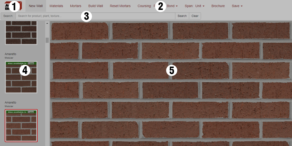 This group of buttons is the navigation bar for all of the functions of the Masonry Designer. These functions include: Making a new wall size, choosing a new material (Acme Bricks), choosing a new mortar color, build button to change the wall area to your selected brick product, resetting the mortar color without changing the wall design, the coursing pattern, the span, a print function with custom pdfs for your selected product, and how to save your wall design or seamless tile. Click Navigation Features to learn how to use each feature.