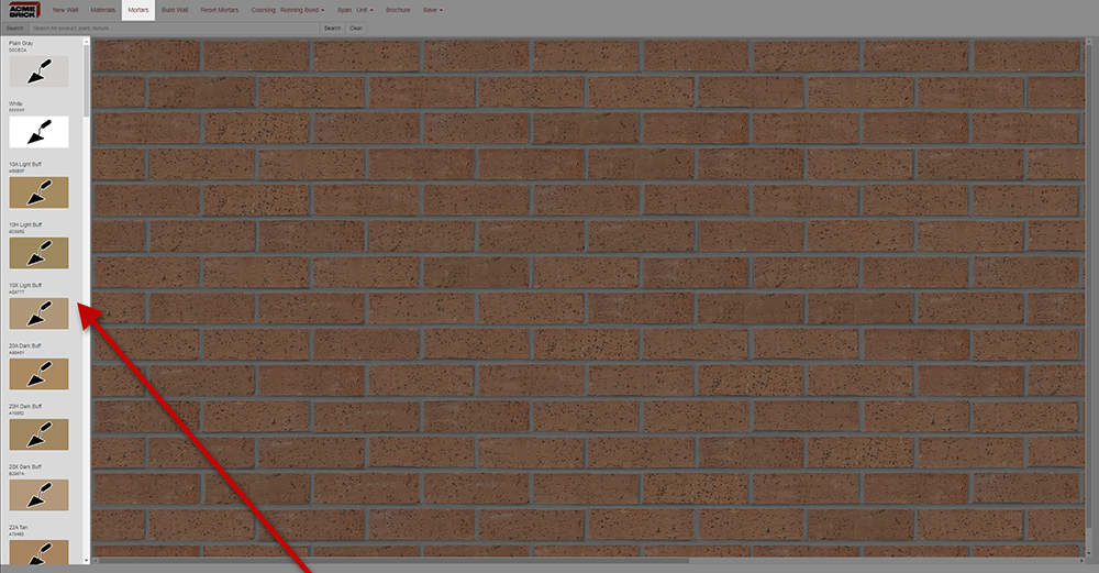 You can change the mortar in 2 ways. First, you can just click the mortars button to select a color, you will see a red border appear around the button. After that click 'Build Wall' in the top navigation bar next to 'Mortars'. You will see the 'Wall View' area build a wall with the current brick and mortar color selections you have made.