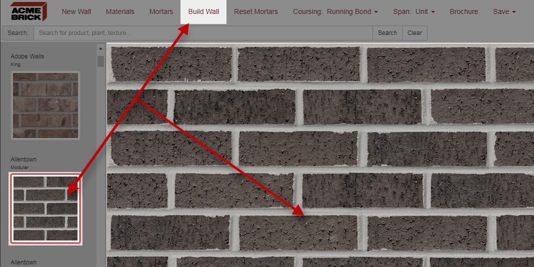 This button in the Masonry Designer changes the bricks built in the 'Wall View' area. You can scroll through the list of Acme Brick Co. products. Once you find a brick you would like to see in the view area, click the product button. A red border will appear and click the 'Build Wall' button on the top 'Navigation Bar'. This will populate the wall view with your latest product selection.